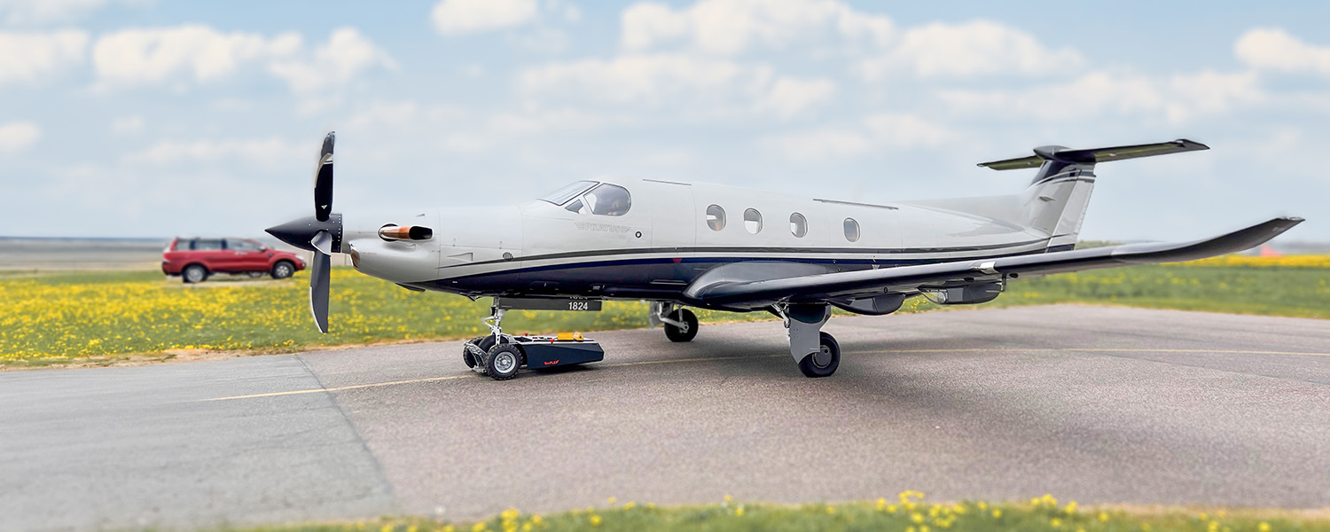 The TF3 is the smallest remote controlled aircraft tug of TowFLEXX. Within a few seconds the aircraft is picked up and can then be effortlessly manoeuvred to the desired location by remote control. The nose wheel is mounted on a specially designed turntable, which allows the operator to turn the tug 360° around the nose gear without twisting it.